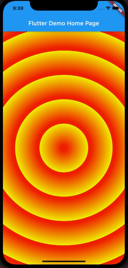 Un RadialGradient es otro de los gradientes en Flutter y el tipo normal tiene un centro y un radio. El punto central corresponde a 0.0 y el anillo en el radio desde el centro corresponde a 1.0. Estas longitudes se expresan en fracciones.
